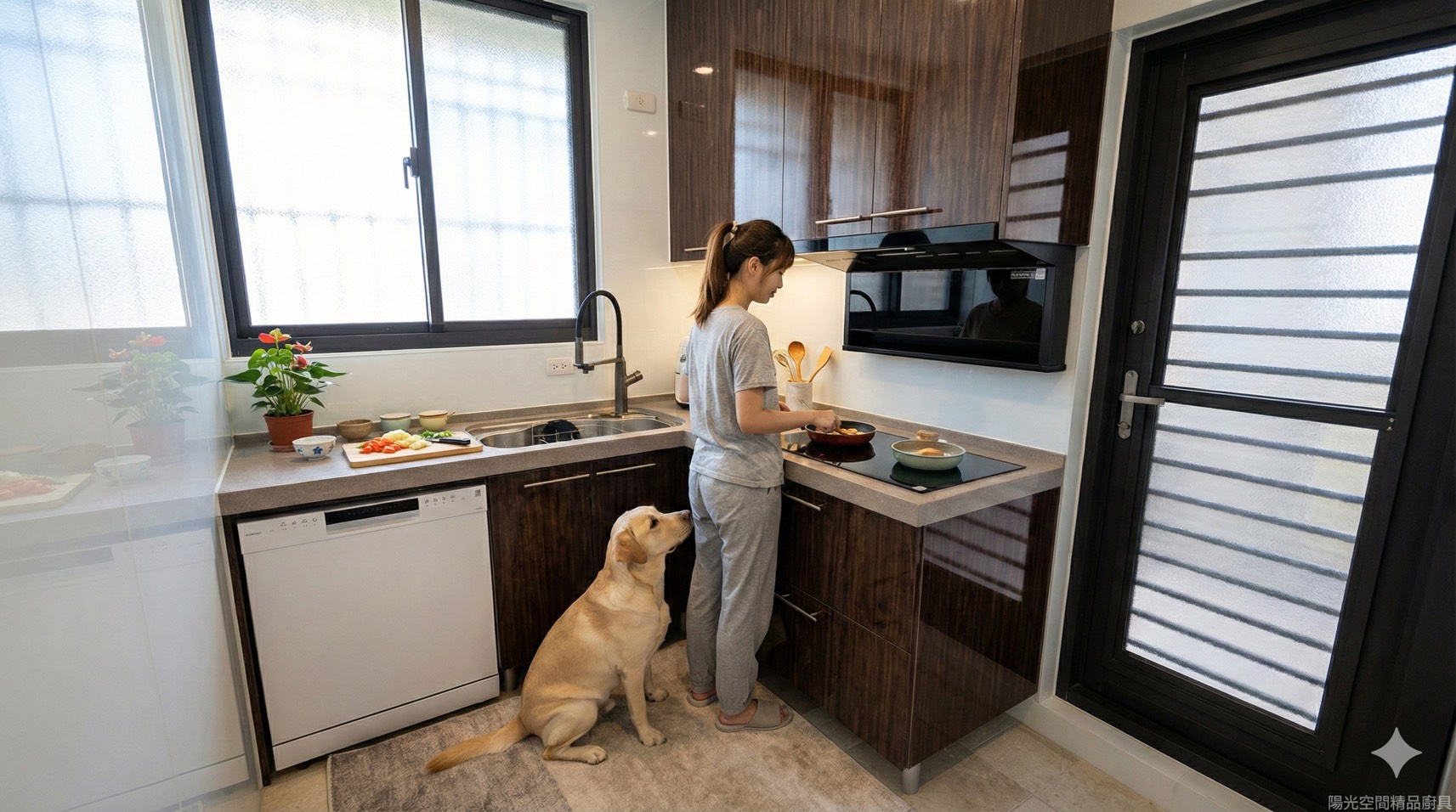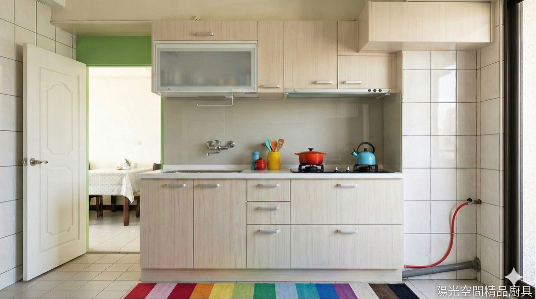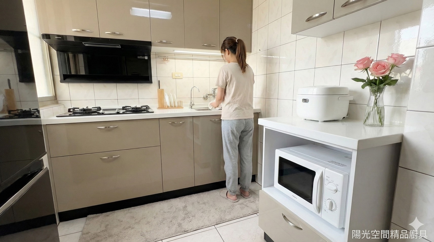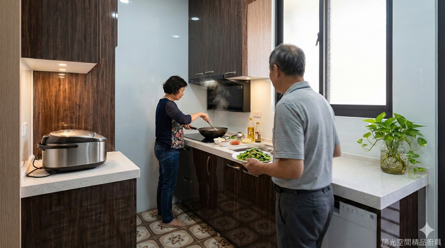 同一位業主一次向陽光空間精品廚具規劃兩戶廚房,本案為孝親房使用的第二戶,採二字形配置,正面241cm、背面126cm,洗碗機與熱水器一次到位,讓長輩日常使用更安全省力。