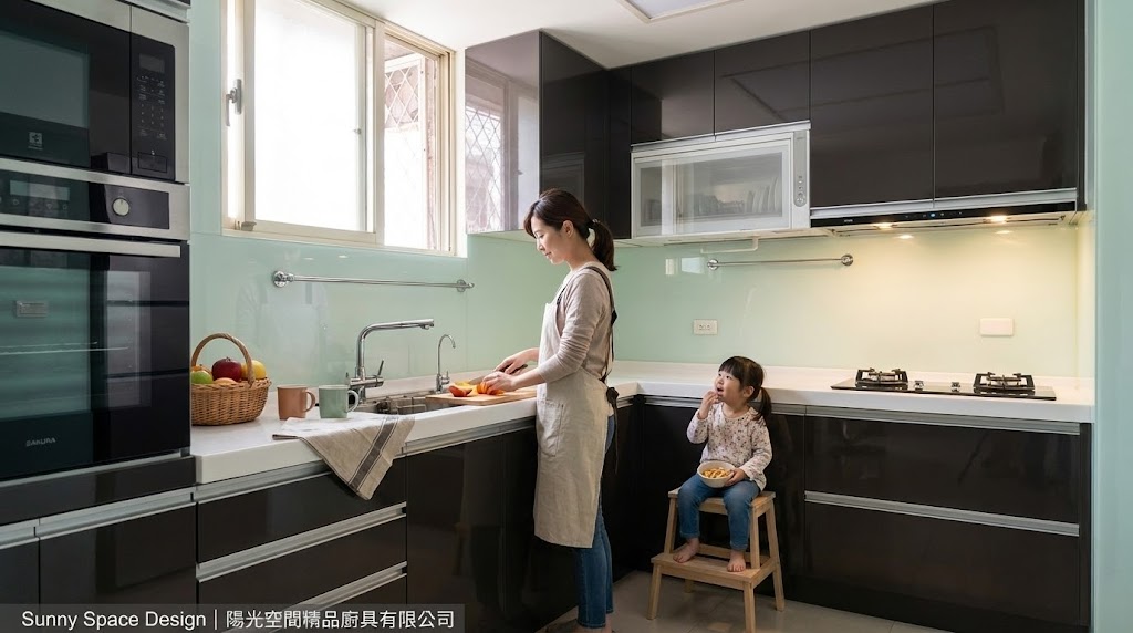 221×259cm L 型深咖啡色廚具,搭配薄荷綠烤漆玻璃與懸吊式烘碗機。動線流暢、收納完整,水槽櫃採不鏽鋼桶身更耐用。卓小姐家的日常廚房,兼具質感、美觀與好清潔,是年輕家庭喜愛的安心實用款。