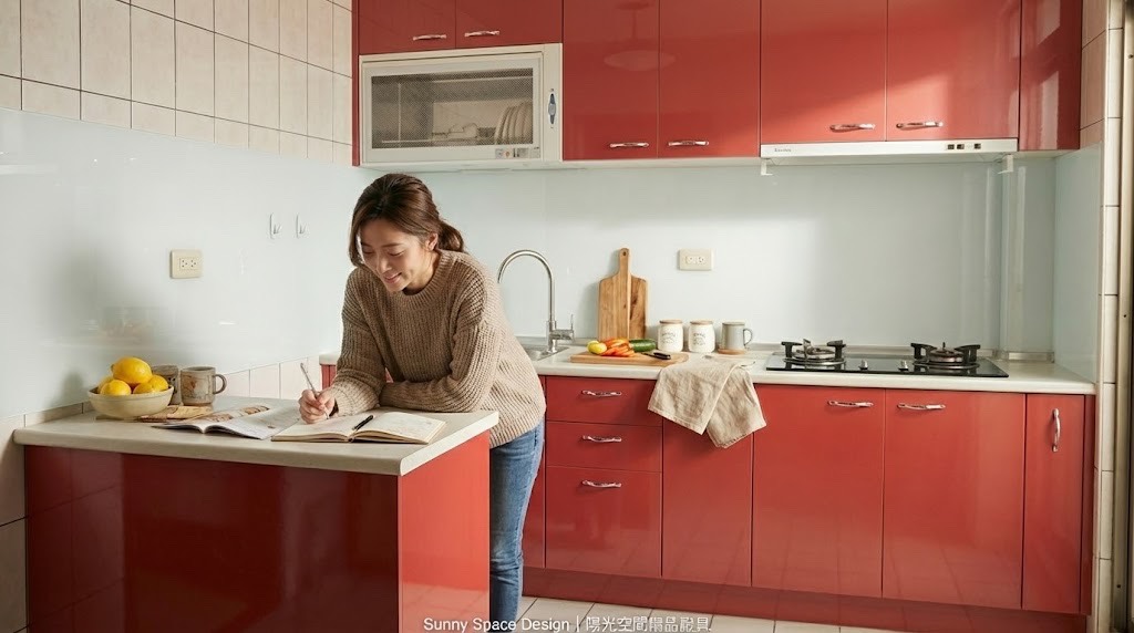 本案位於新北市新莊區中港二街,235cm 廚具搭配 80cm 電器平台櫃,以上白下紅的跳色水晶門板打造輕盈又活潑的「健康小紅廚房」。採用韓國人造石檯面、木心板桶身與喜特麗三機,機能完整、視覺亮眼,為屋主一家帶來每日的活力與好心情。
