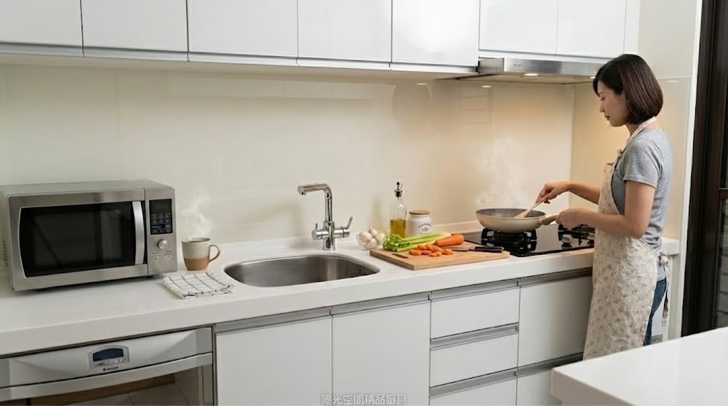本案位於新北市板橋區莒光路,L 型 147×305cm 廚具配置,結合六面結晶鋼烤門板、韓國人造石檯面與烤漆玻璃背牆,長型空間轉角完美利用,機能與時尚兼具。
