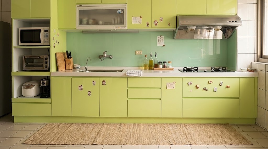 新北中和中山路三段的一字型平果綠廚房,300cm 主櫃搭配 60cm 電器櫃,清新色調加上實用機能,讓每天走進廚房都像走進一座小小青蘋果樂園。