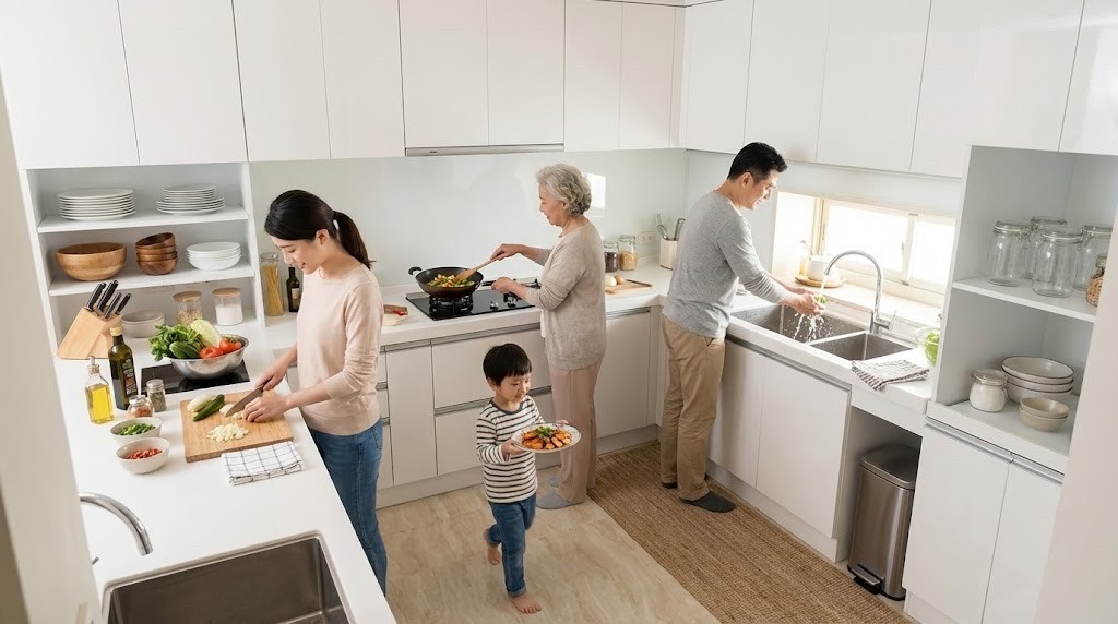 本案位於新北市深坑深南路,290×135cm L 型廚具配置,白色六面結晶鋼烤門板搭配淺綠跳色外框,結合黑色烤漆玻璃,呈現溫柔、清爽又帶著「回家感」的料理空間。