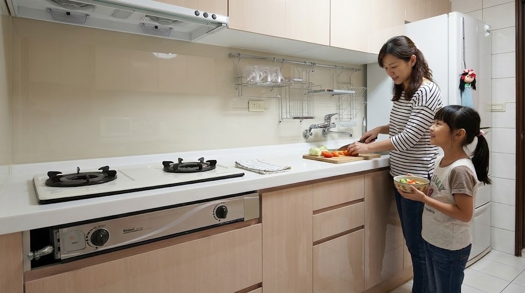 白色無把手廚具,搭配粉紅色烤漆玻璃,打造專屬職場新女性的自信風格廚房。位於蘆洲光華路,小尺寸也能做出高質感!|陽光空間精品廚具