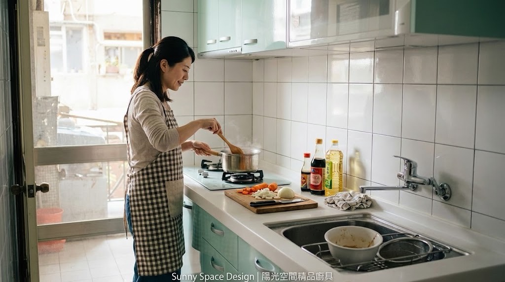 桃園博愛街邱先生一字型廚具(212cm),由傳統分件式廚具升級為歐化系統廚具。採用韓國人造石檯面、木心板桶身與水晶門板,搭配 C 型崁鋁把手;瓦斯爐改為檯面式並於牆面貼烤漆玻璃,有效減少清潔死角,讓完工成果與設計圖高度一致,質感與實用兼顧。