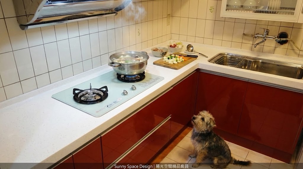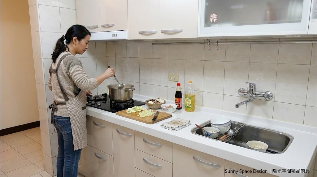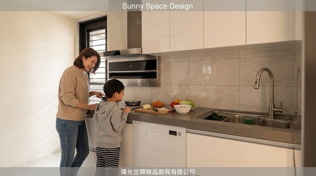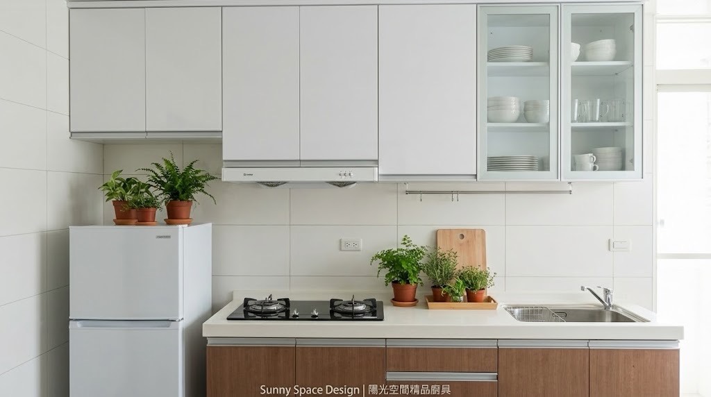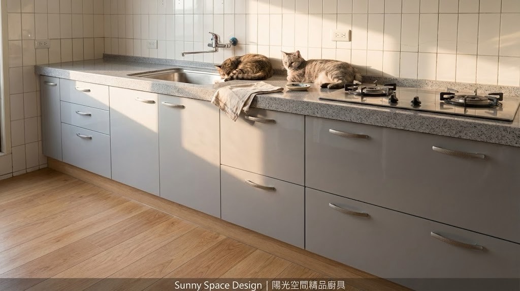 板橋華江一路謝小姐一字型廚具,尺寸 253cm。檯面特別加深至 67cm,搭配上櫃底部層光燈,完整解決料理時切菜照明不足問題。選用矽鋼石檯面與六面結晶鋼烤門板,搭配林內頂側雙吸排油煙機與 ASKO 洗碗機,實用與機能兼顧。