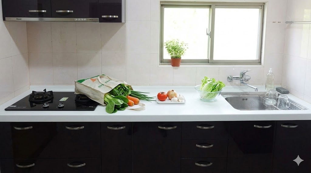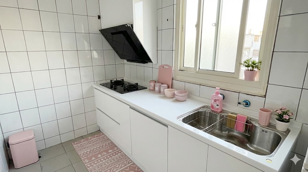 新北市樹林東榮街戴小姐家的這套一字形 242cm 漫畫廚具,以純白水晶門板搭配方格磁磚,彷彿走進黑白漫畫場景。搭配韓國人造石檯面 PF812、櫻花近吸除油煙機 R7600、二口檯面爐與 DANCO 鋁抽、調味側拉架與嵌門烘碗機,讓小廚房在俐落線條中兼具收納、機能與質感。