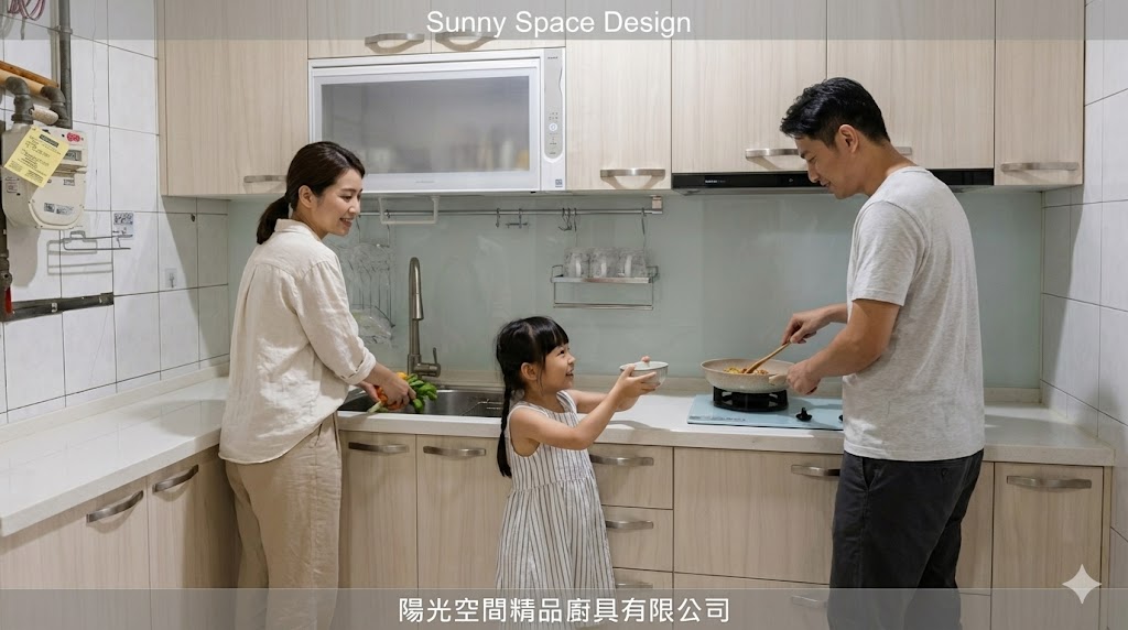 這套一字型 272cm 加 85cm 電器櫃的廚具,以矽鋼石 SI-105 搭配淺木紋與霧灰檯面,打造溫柔中性的「好好吃飯廚房」。現場有天然瓦斯管、光線不足與收納需求,我們透過補板閃管、T5 層光燈、踢腳板抽、凹型拉籃與 85cm 大電器櫃規劃,再搭配櫻花渦輪變頻抽油煙機、雙口玻璃爐與韓國防蟑防臭水槽,讓屋主可以用平常心面對生活,好好煮飯、好好吃飯。