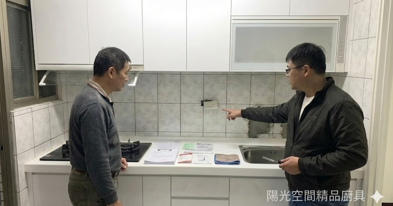 新北板橋金門街盧先生|一字型 220cm 廚具+強制排氣熱水器改管,從檯面龍頭、水電路線到烤漆玻璃,一次把安全與好用都兼顧。