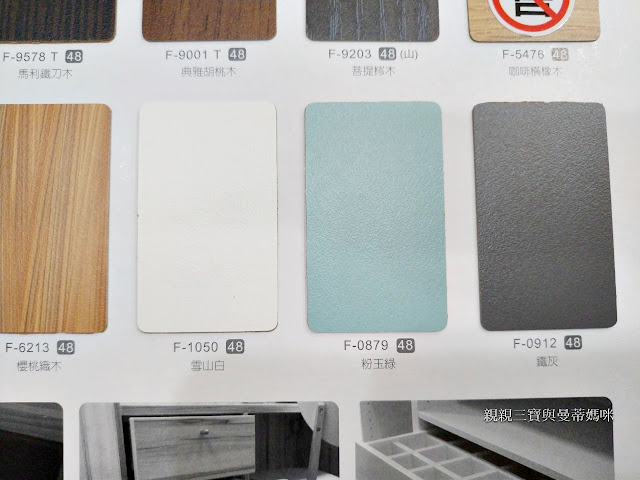看完展示,接下來就是要來挑門板及以及檯面的色系,曼蒂媽原本就設定就是找偏薄荷綠或是湖水藍之類偏鄉村風的色系,翻開色板,一眼就象中了這一小塊[粉玉綠】