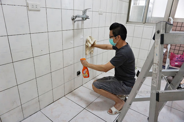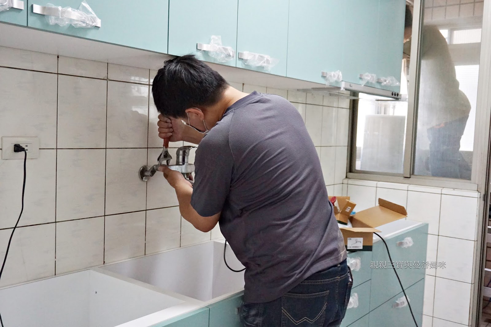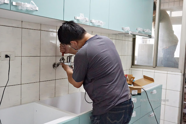 舊有水龍頭的部分是在牆面,曼蒂媽其實很不喜歡,但房子是租的,所以也不會做到打掉牆面改水路的方式,於是只有更新水龍頭