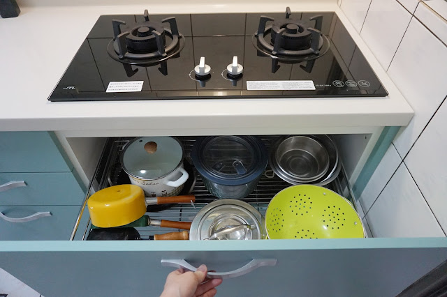 好喜歡現在瓦斯爐下方有著大拉籃,可以收納更多,把原本擺在廚房後方,擺的雜亂的鍋碗瓢盆都藏進來後。廚房看起來更簡潔有力