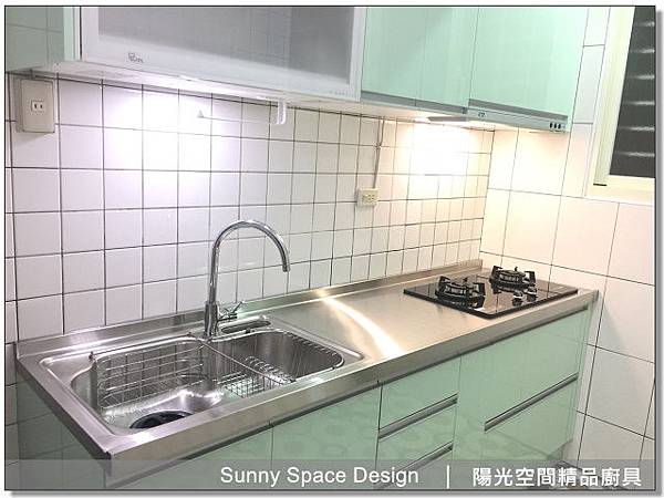 材質:不銹鋼檯面+木心板桶身+水晶門板+門板崁G型鋁把手