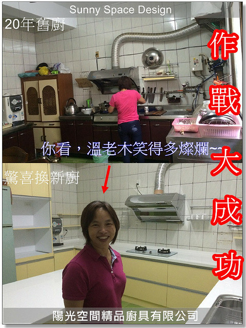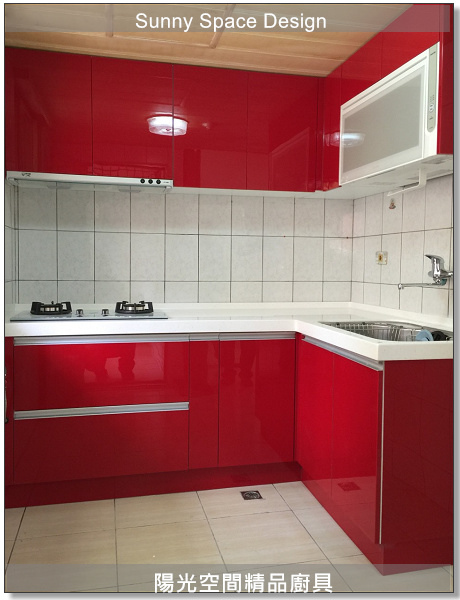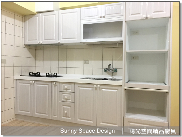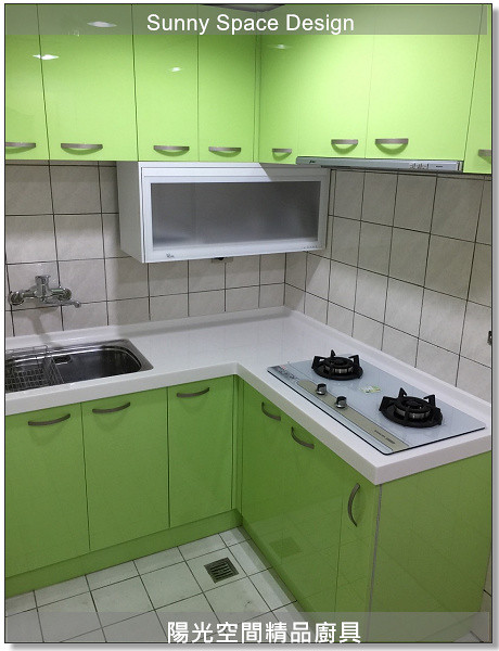 材質:韓國人造石檯面+木心板桶身+水晶門板501+上櫃門片下降,下櫃門板崁G型鋁把手
