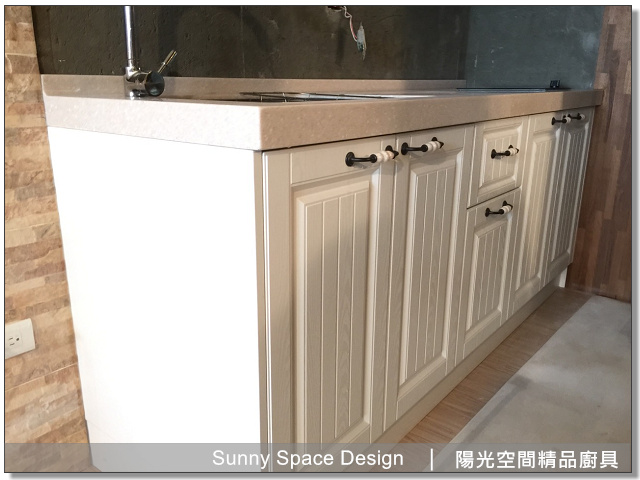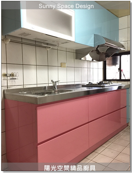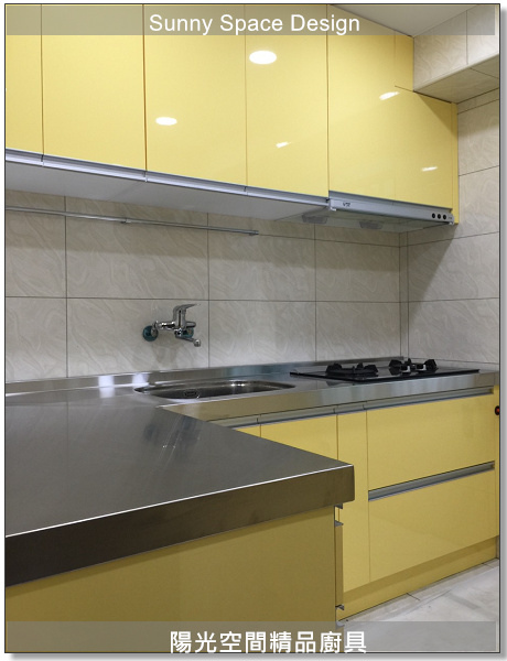 材質:不銹鋼檯面+木心板桶身(水槽櫃不銹鋼桶身)+六面結晶鋼烤門板+門板崁G型鋁把手