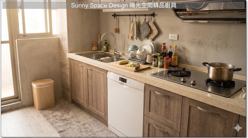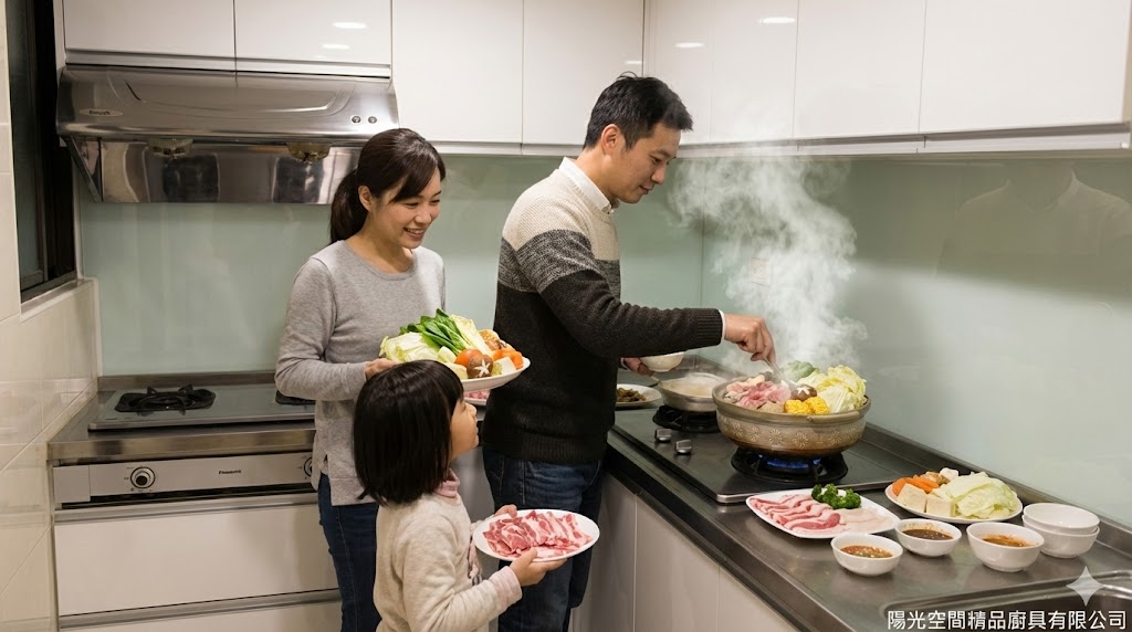 懷孕時期最需要的是一個讓媽媽能安心、爸爸能展現愛意的廚房。這套 L 型高效廚房結合出餐吧檯與三格電器櫃,真正做到「省力、好拿、好收」。