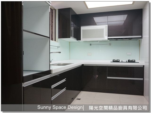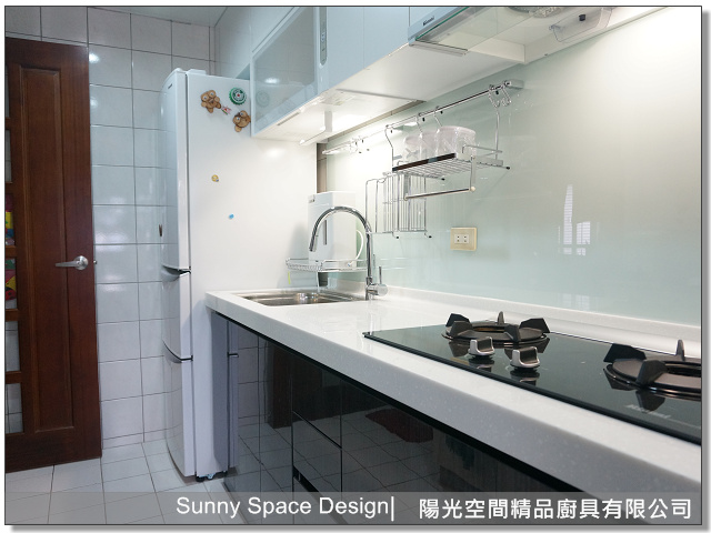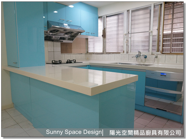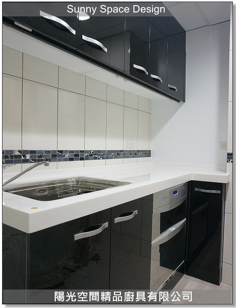 施工地點:新店安民街 材質:韓國人造石檯面+下櫃不銹鋼桶身,上櫃木心板+水晶門板+45度斜把手
