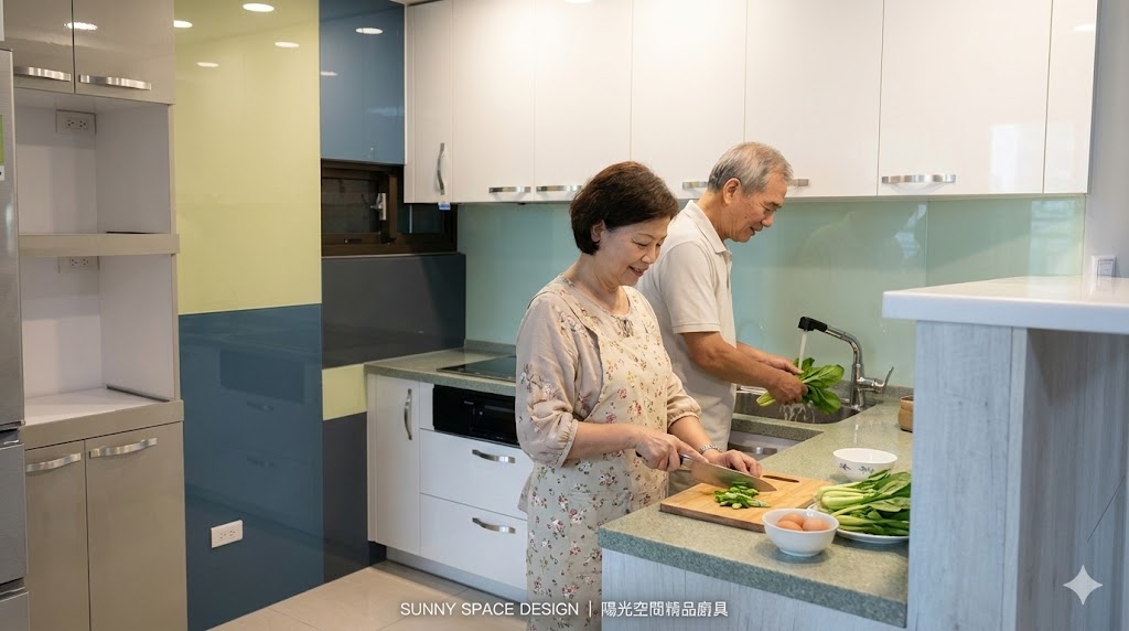孩子長大的速度超乎想像,在這個小而溫暖的廚房裡,媽媽與孩子一起開冰箱選點心,生活感滿溢。電器櫃整合微波爐、烤箱、穀片區,空間乾淨、動線順暢,是最適合親子家庭的小坪數廚房設計。
