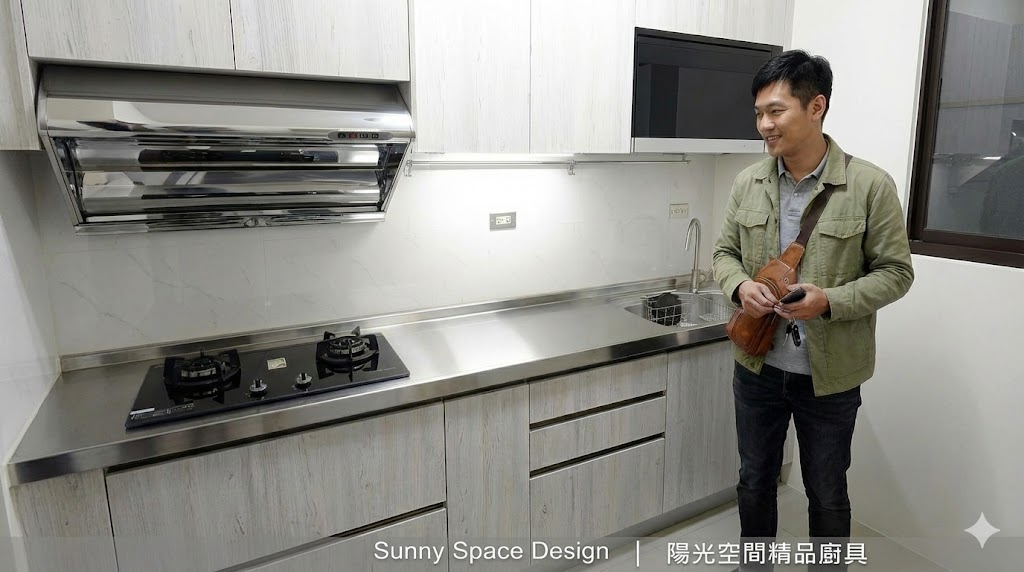 296cm 一字型不鏽鋼廚具,銀色俐落、極簡耐用,搭配水晶門板與完整收納設備,呈現 Less is More 的清爽廚房。