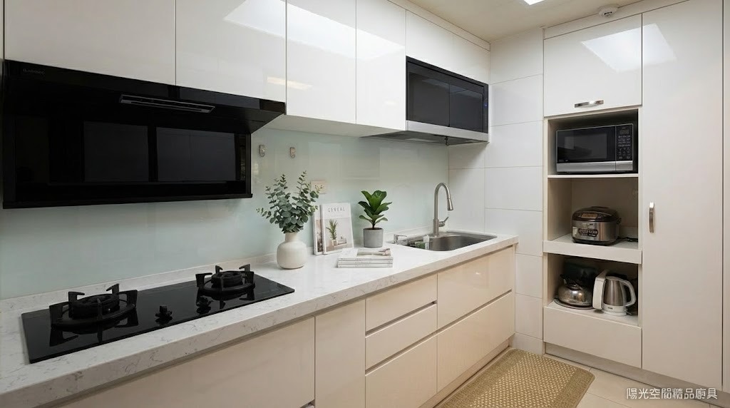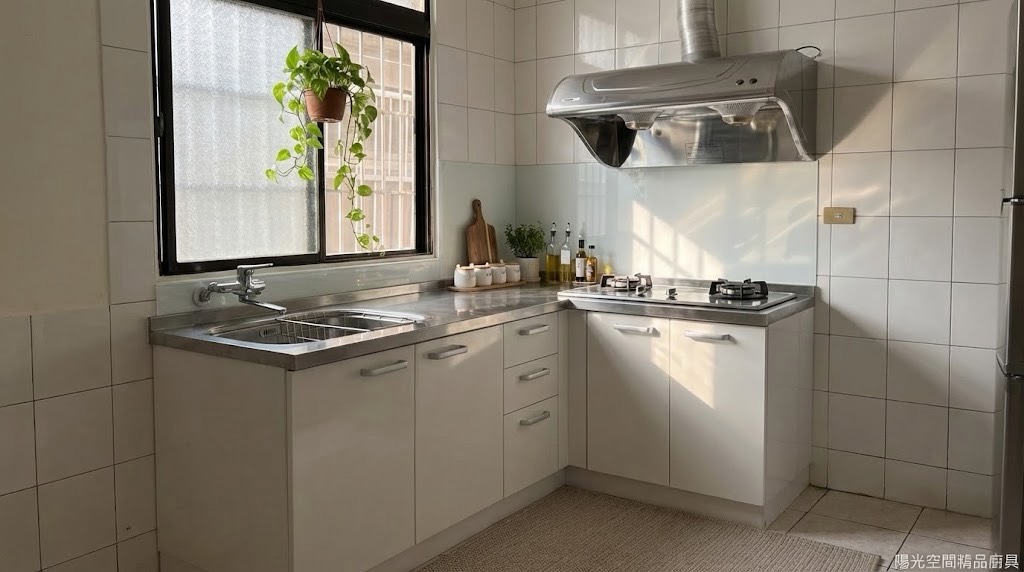 這是一套不追求華麗,而是讓人安心的 L 型廚具配置。304 不鏽鋼檯面、水晶門板與純白色調,成為屋主在紛亂世界中,能夠回家好好生活的一個安靜角落。
