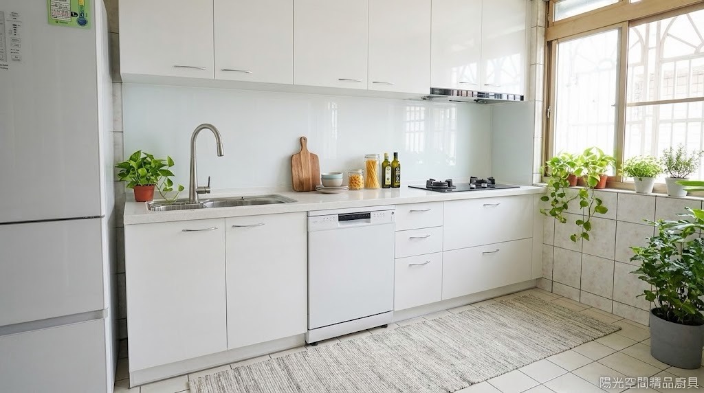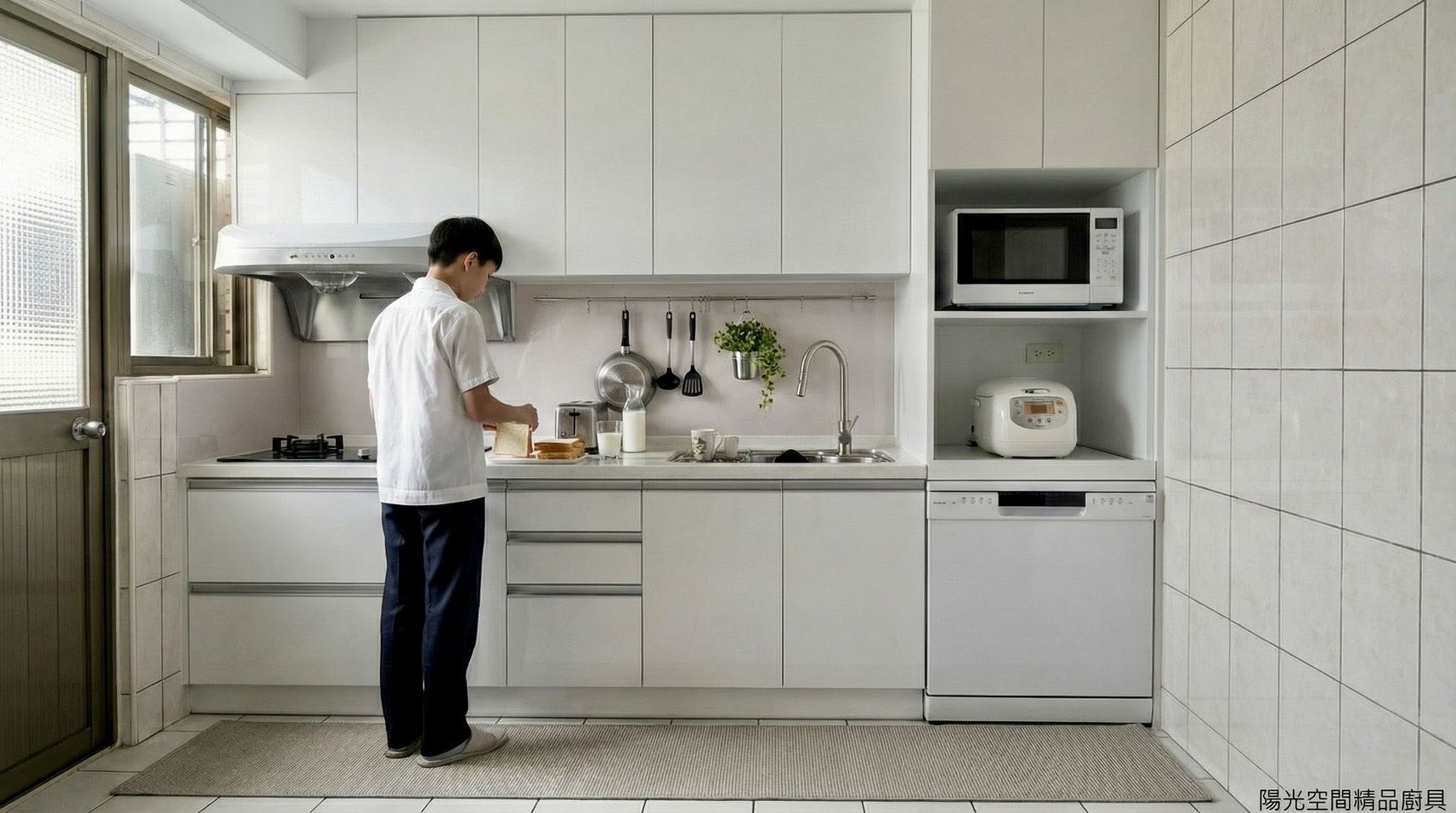 地面明管無法更動的廚房條件下,透過抽屜型洗碗機與下方收納配置,完成一套真正替生活減輕負擔的一字型廚具案例。