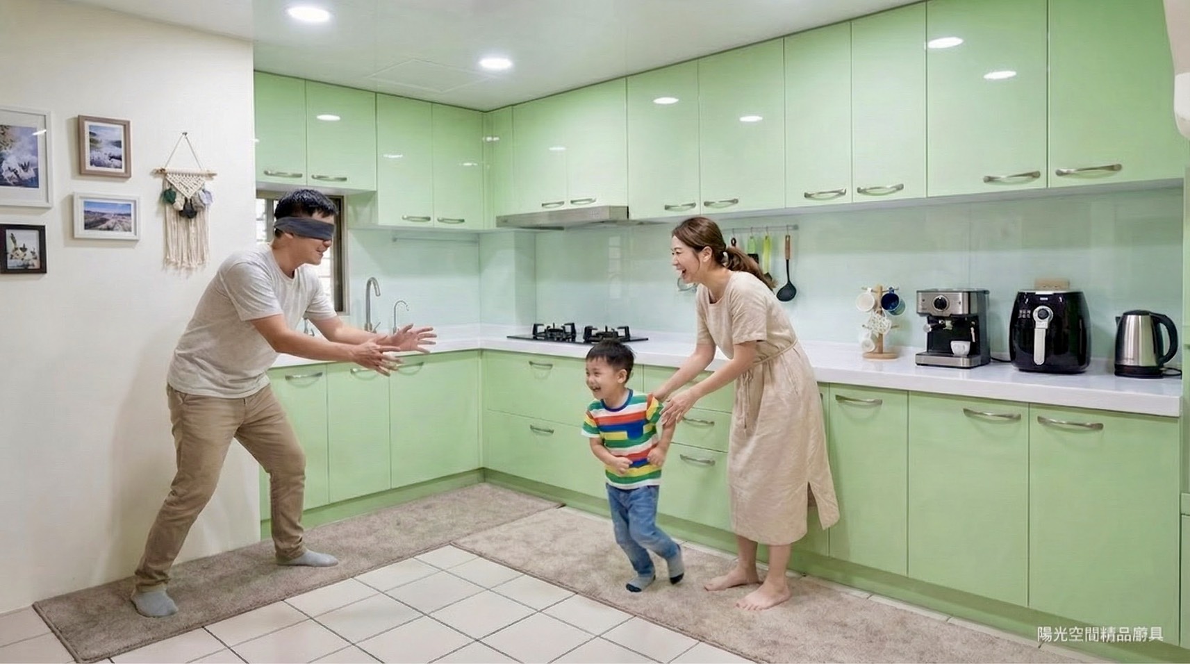 內湖環山路江先生一家|L 型 173cm+449cm|薄荷綠結晶鋼烤 × 韓國人造石,把家的笑聲留在廚房