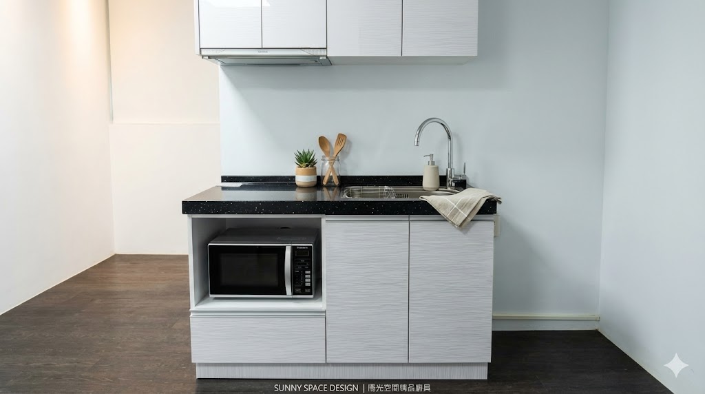「套房小廚具怎麼做才剛好?」 本案一次打造 4 組 130cm 小流理台, 為租屋用途量身規劃:檯面、微波爐空間、水槽配置都以實用為主。 麻雀雖小、功能完整,適合單身與外食族的輕量廚房。
