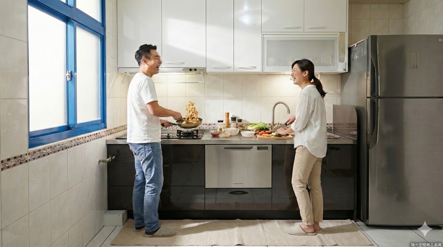 這是一間陪伴屋主十多年的老屋廚房,在不追求華麗的前提下,透過 304 不鏽鋼檯面與水晶門板,重新整理出順手、耐用、能安心下廚的生活節奏。