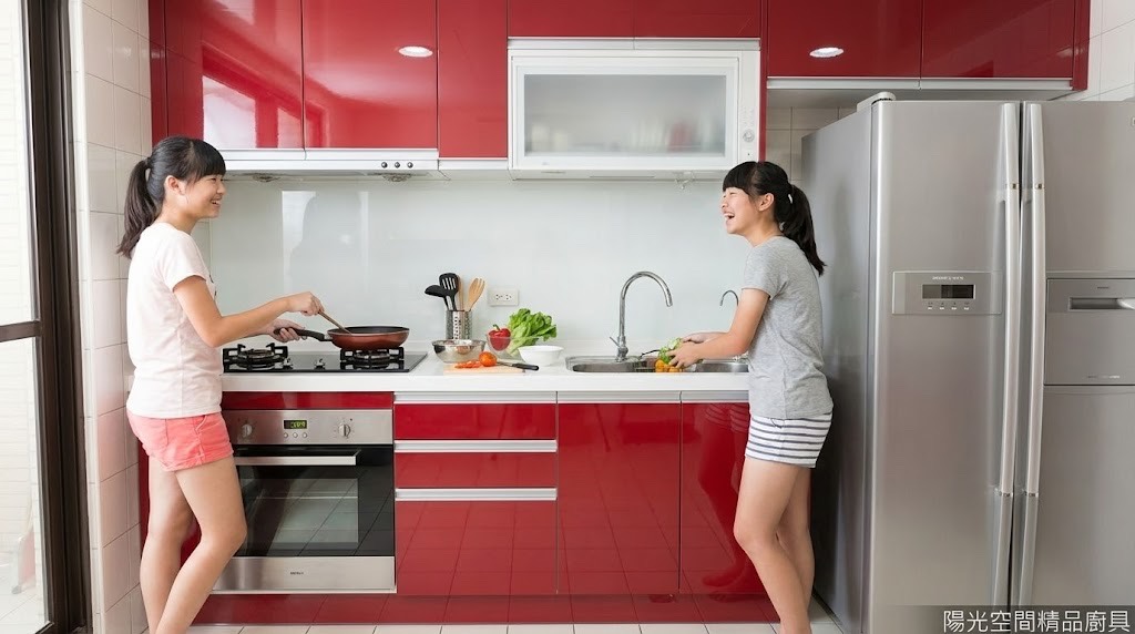 新莊中正路二字型廚房,以紅色結晶鋼烤門板搭配韓國三星人造石與矽鋼石,打造亮眼卻不浮誇的小豪宅級配置。電器整合、平台延伸、收納完整,是耐看又實用的高質感廚房。