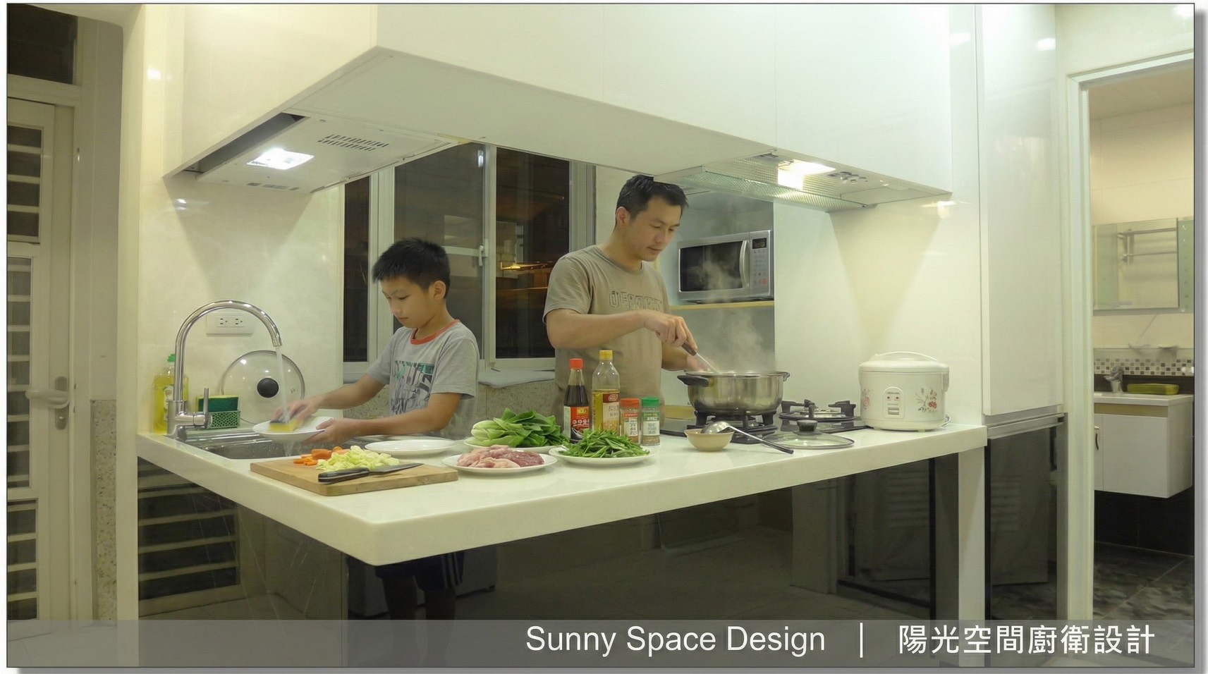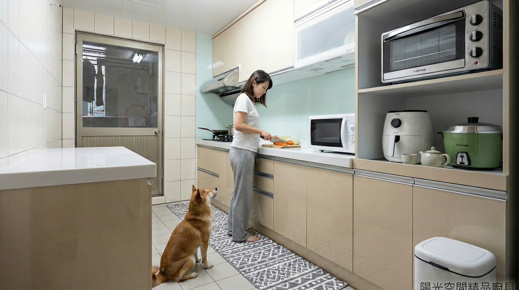 台北八德路四段,ㄇ字型 131×230×131 廚具,以結晶鋼烤門板打造「外冷內熱」的顏色反差。利用廚具本體形成隔間,避柱、隱煙管、內藏收納,一次解決動線與美感。