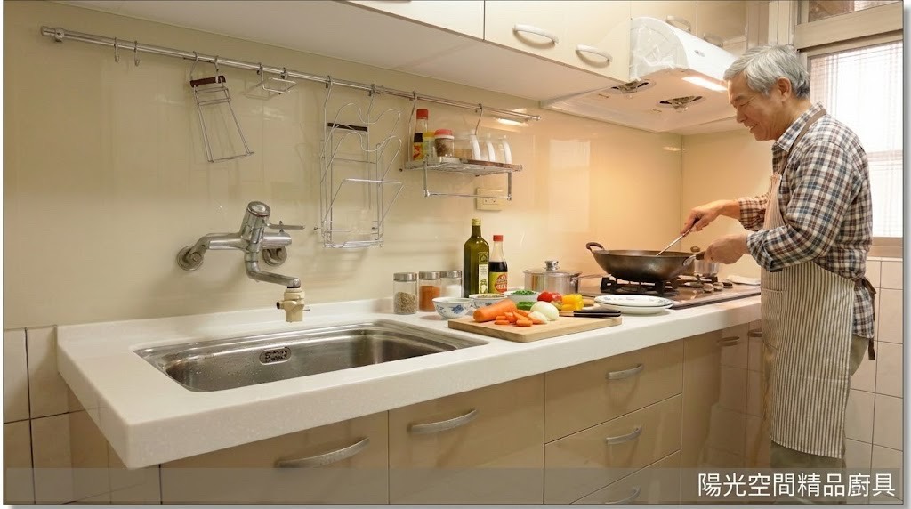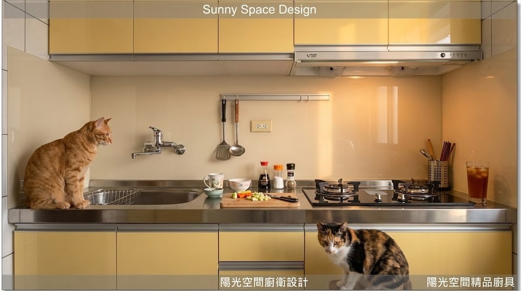 新莊昌平街一字型 189CM 廚房,以不鏽鋼檯面 × 結晶鋼烤門板打造亮潔俐落的質感。淡黃色門板平衡金屬冷調,搭配 G 型鋁把手與隱藏五金,呈現清爽又活潑的現代小廚房。
