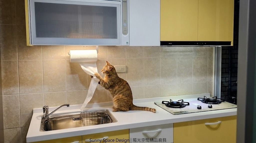 位於新店美河市社區的一字型廚房案例,全新規劃施作。整體以溫暖黃色結晶鋼烤門板為主,中段門板局部跳白色,創造視覺層次。搭配石英石檯面與櫻花牌廚房設備,在貓咪陪伴下,打造日常最剛好的幸福料理時光。