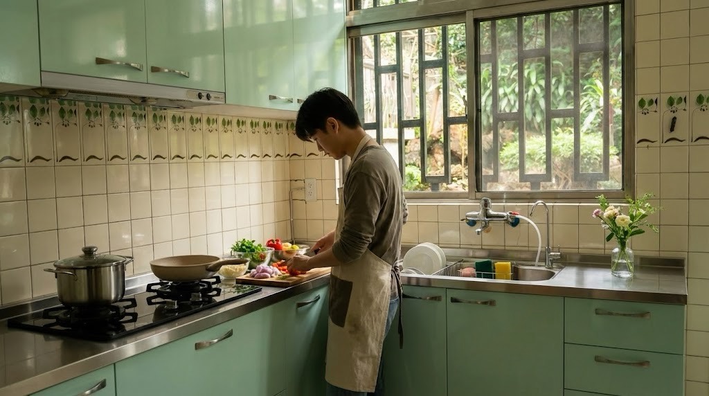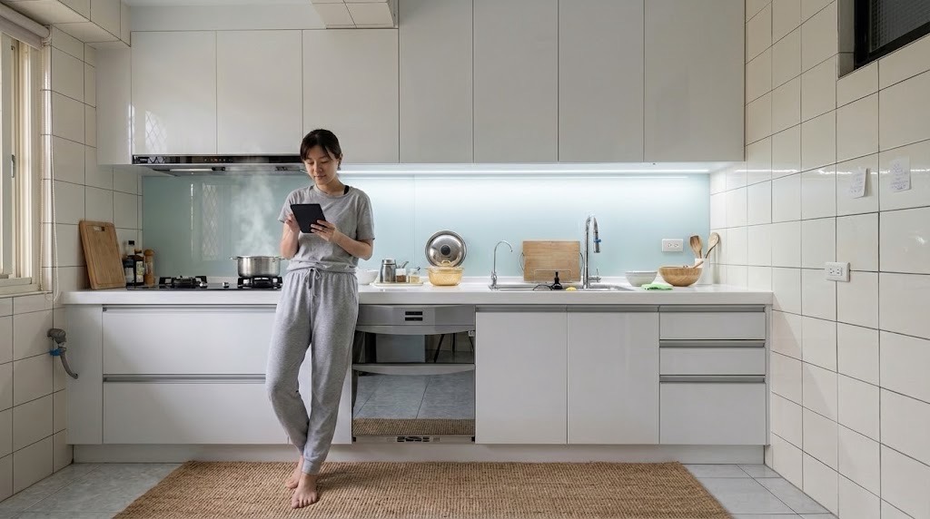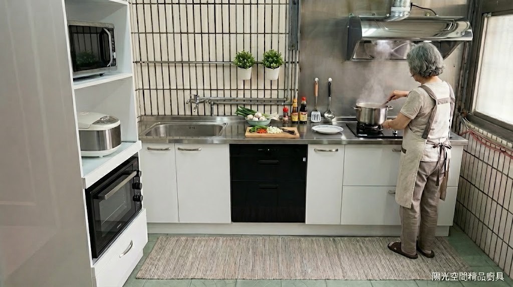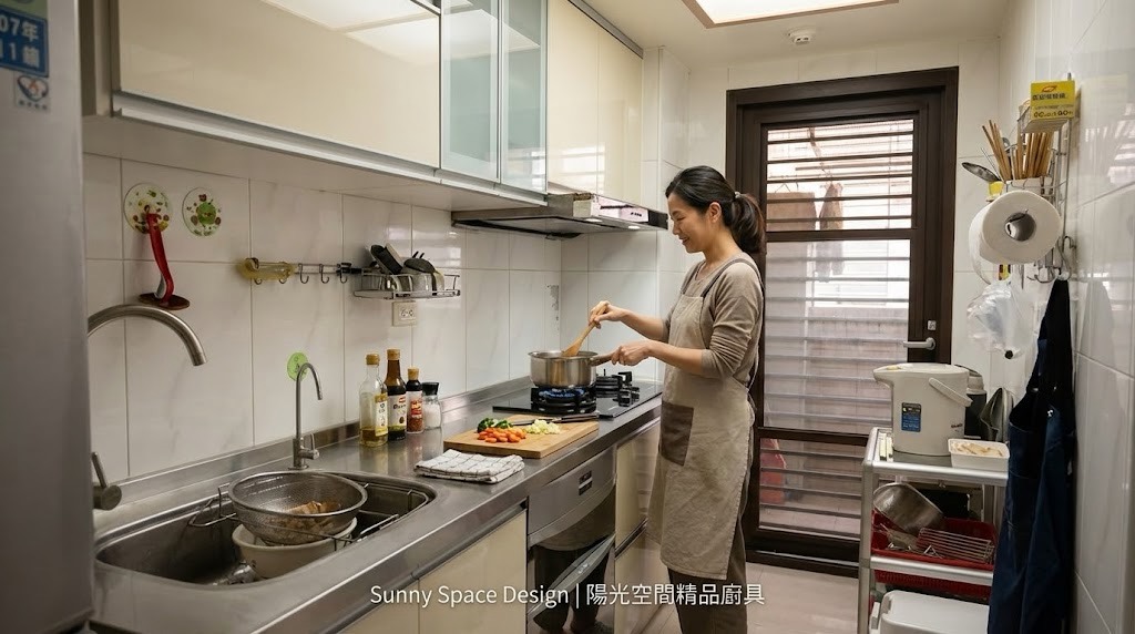 女兒心疼媽媽多年站在老廚房裡彎腰、將就,決定拆除整套舊櫃,重新換上一套真正為使用者設計的一字型不鏽鋼廚具,讓每天下廚這件事,少一點勉強。