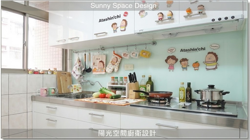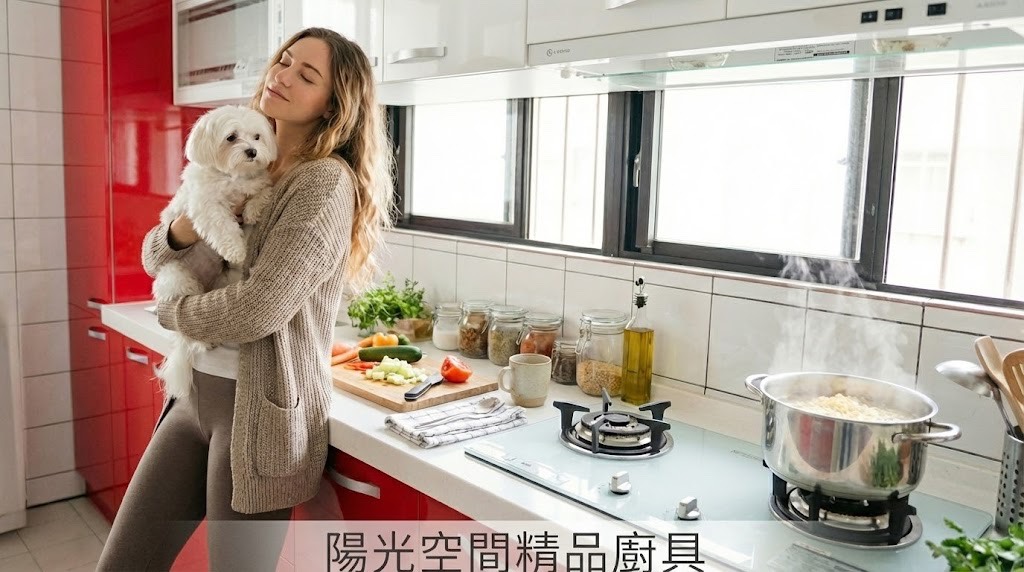 基隆義二路透天宅,以紅白跳色打造童心系現代廚房。六面結晶鋼烤搭配櫻花三機,兼具機能、個性與耐用性。