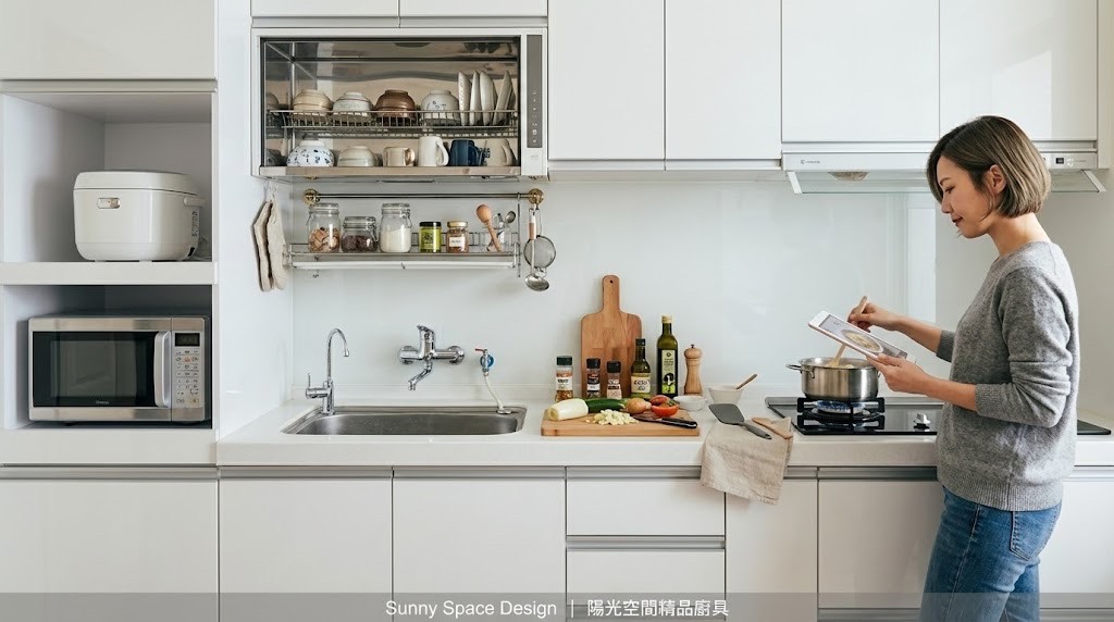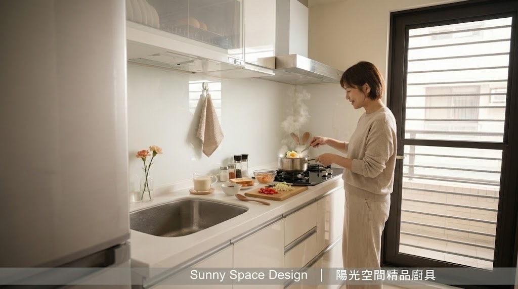 三重安慶街陽台改廚房案例,使用美耐門板與豪山二機,巧妙利用陽台空間打造 L 型高機能廚房,增加收納與工作平台,讓室內生活空間瞬間變大。