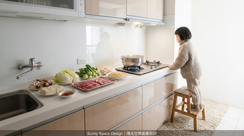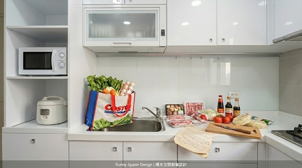 三重下竹圍街小坪數 L 型廚房,善用轉角與電器櫃配置,豪山三機+人造石檯面,讓小家庭也能擁有順手、好用、收納量夠的實用廚房。