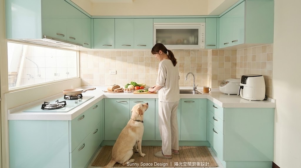 從國中到現在反覆播放的歌,像一條時間的河,靜靜流進這間設計師的ㄇ字型廚房。窗光、稻香、層次線條,都是回家最剛好的理由。