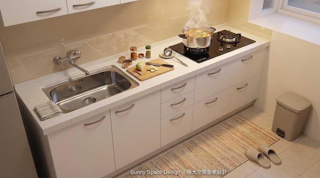 《冬日暖心純白一字型廚房》|北部長條型標準配置 × 溫暖系日常