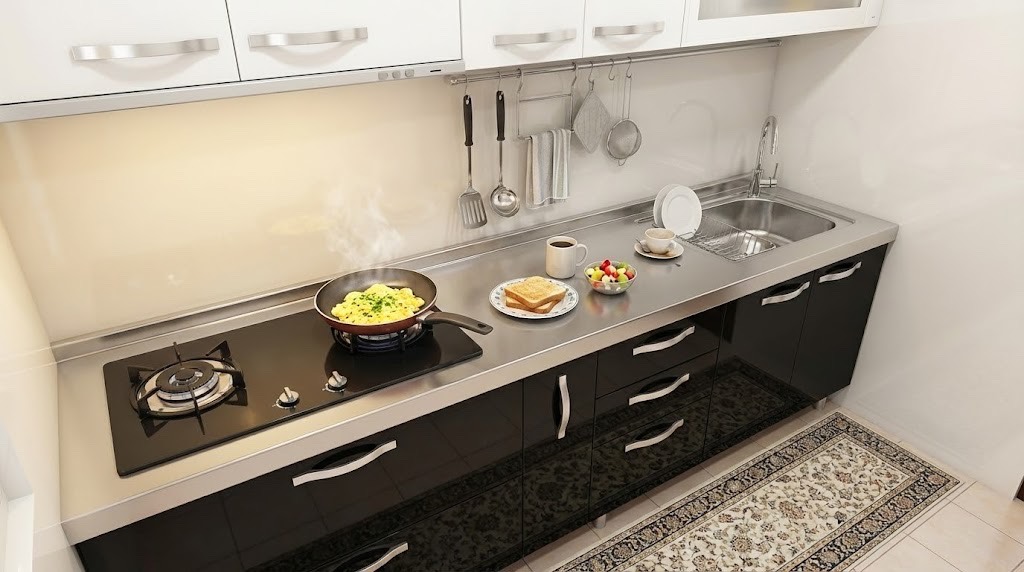 當空間有限,智慧就更重要。本案以不銹鋼檯面搭配水晶門板,巧妙將微波爐收進櫃體內,讓小廚房也能擁有清爽而完整的料理節奏。