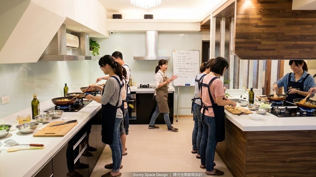 由客廳與臥室蛻變而成的烹飪教室空間,整合主廚吧檯、學員實作區與放鬆和室,讓料理教學不只是技術傳遞,更是一場溫度與香氣的集體記憶。