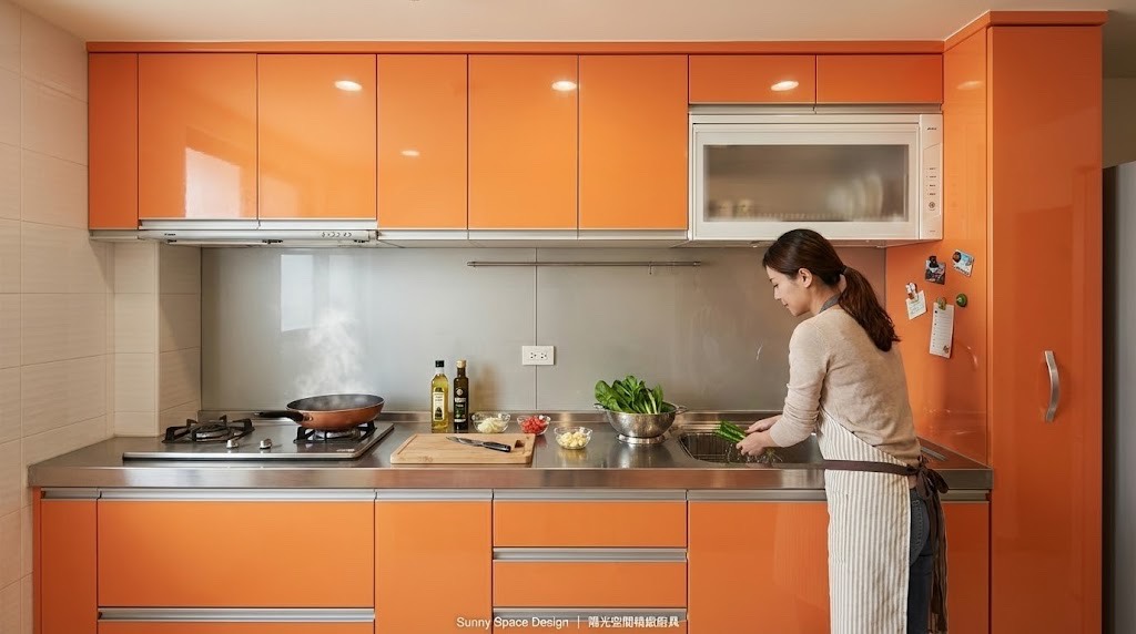 位於新北板橋新海路的 314cm 一字型橘子系廚房,不銹鋼檯面搭配水晶門板與 G 型鋁把手,用亮麗色彩點亮日常,也讓料理空間多了一份活力與爽朗。