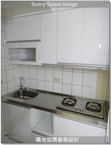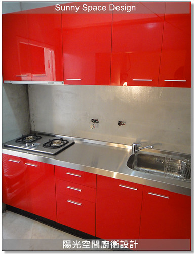 尺寸:194CM廚具上下櫃+89CM上疊櫃 材質:不銹鋼檯面+不銹鋼桶身+水晶門板+門板崁G型鋁把手
