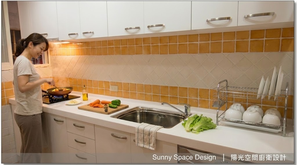 桃園中壢中明路 299CM 上下櫃廚具,採用台灣人造石檯面與水晶門板,搭配美式鄉村風磚牆,呈現清新明亮的美式風格料理空間。