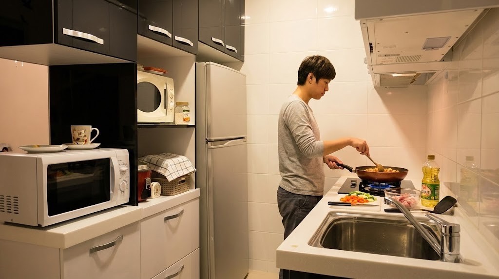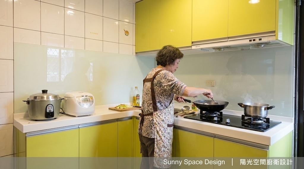 在不大的廚房裡,用一點「辣口味」的芥末綠點亮日常。170×160cm 的轉角配置,搭配人造石檯面與不銹鋼桶身,讓小空間也能擁有自己的俏皮表情。