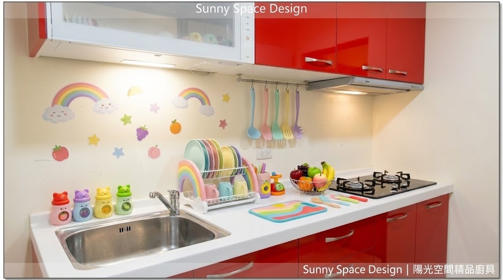 位於土城美麗宏國社區,本案因廚房有 57×60 柱體,規劃成「假L型二字形」動線,一側水槽、一側瓦斯爐,不鏽鋼檯面+不鏽鋼桶身實用耐用,門板選用可愛餐具造型把手,讓日常下廚多了一份童趣。
