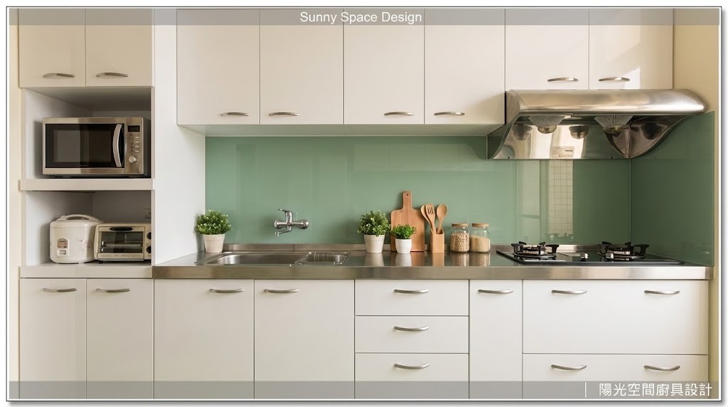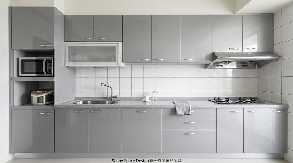 銀色水晶門板搭配花灰色檯面,展現清爽科技感。配置豪山玻璃爐、斜背排油煙機與四格電器櫃,實用與質感兼具的一字型廚具。