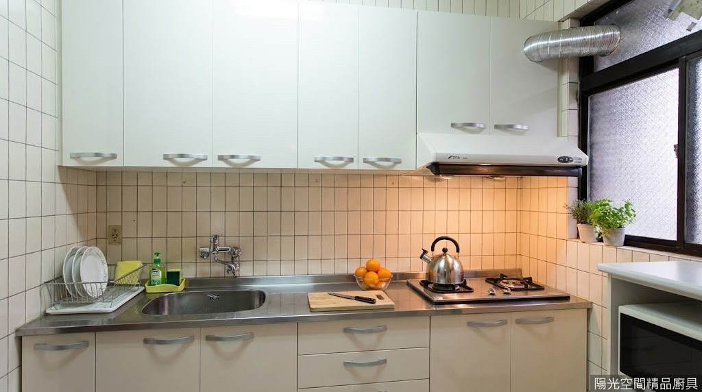 白色簡約一字型廚房,搭配不銹鋼檯面與 60cm 電器櫃,乾淨俐落、收納力大幅提升。水槽櫃改為不銹鋼桶身,更耐潮、耐用,適合出租物件或日常高頻率使用的家庭。