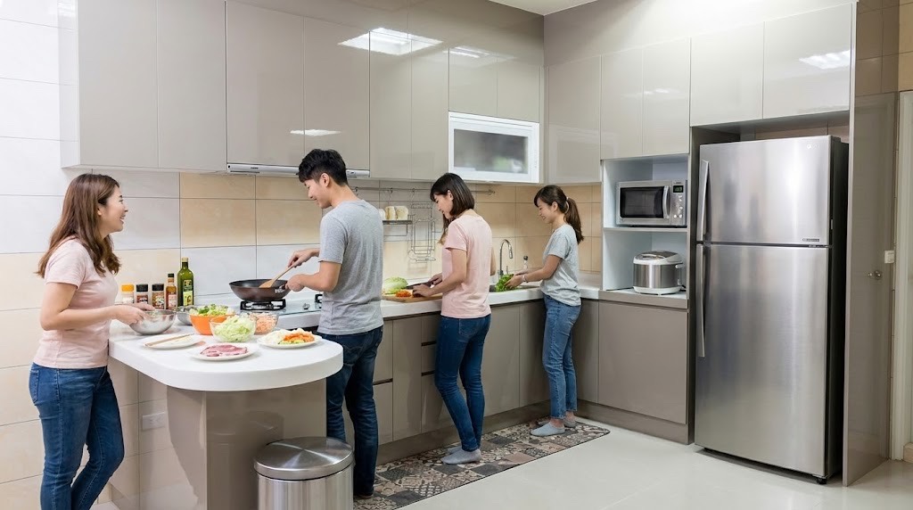 為張先生客製的 250cm 一字型廚具,搭配 120cm 肩高平台電器櫃,以使用習慣為核心打造便利又俐落的廚房動線。不銹鋼檯面、量身訂製電器收納、PVC 踢腳板,實用度滿分。