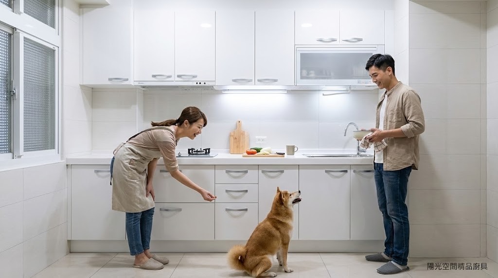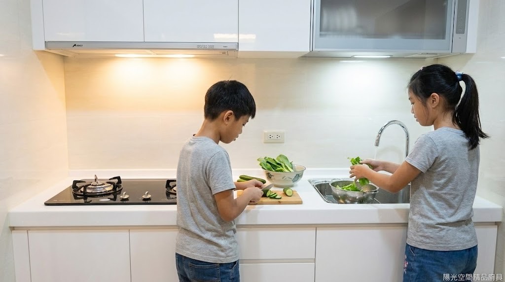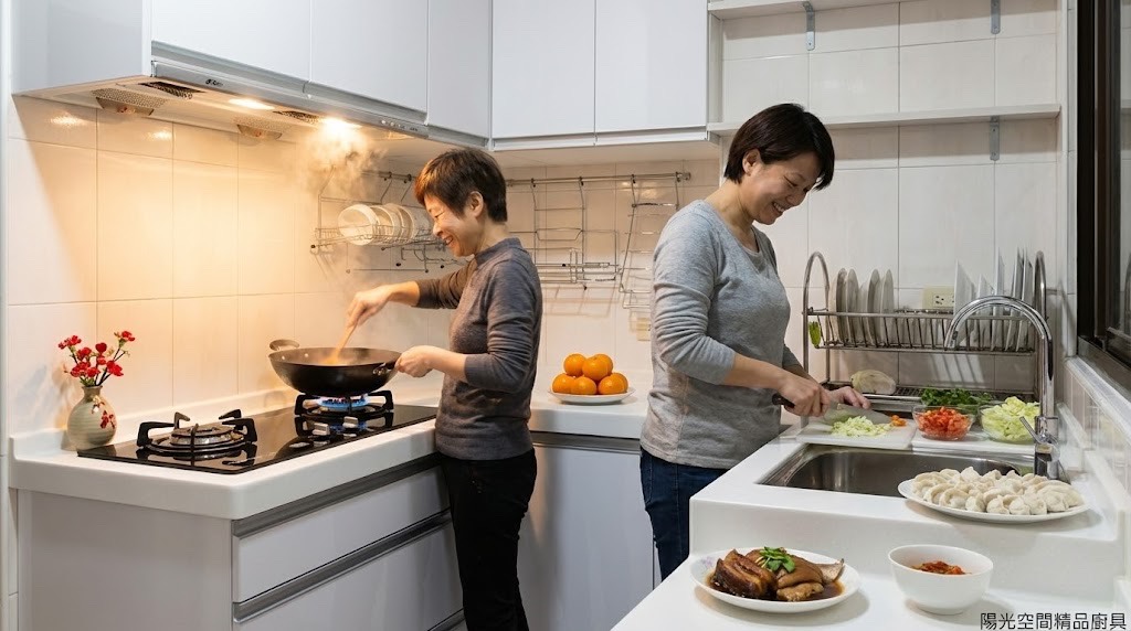 二字型分流動線讓水槽與瓦斯爐互不干擾;懸吊式下櫃減少踢腳板積灰、清潔更容易。搭配不銹鋼檯面、水晶門板與豪山配備,形成俐落、耐用、好整理的永和小家庭廚房。