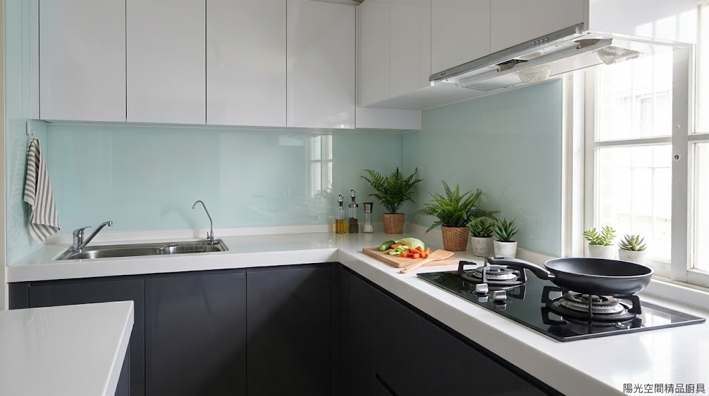 因牆面斜角導致落差 10cm,本案透過 L 型廚具結構巧妙修正,讓空間瞬間變方正。搭配黑白配水晶門板、韓國人造石檯面、45 度斜把手與隱藏式油機,整套廚具極簡、俐落又高級。