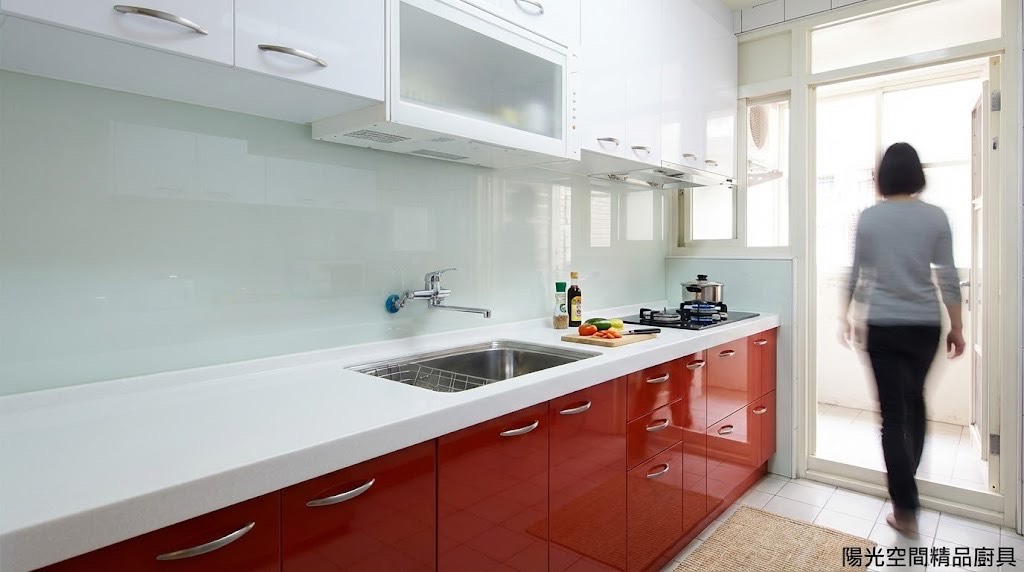 上紅下白的活潑跳色搭配,溫柔與亮度兼具。搭配豪山隱藏式排油煙機、玻璃爐、下降式烘碗機與小側拉籃,打造紅得剛剛好的時尚廚房。